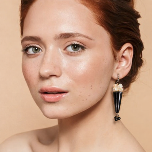 Vintage 1960s Mid-Century Lucite Drop Earrings | Black & Amber Art Deco Style Cones