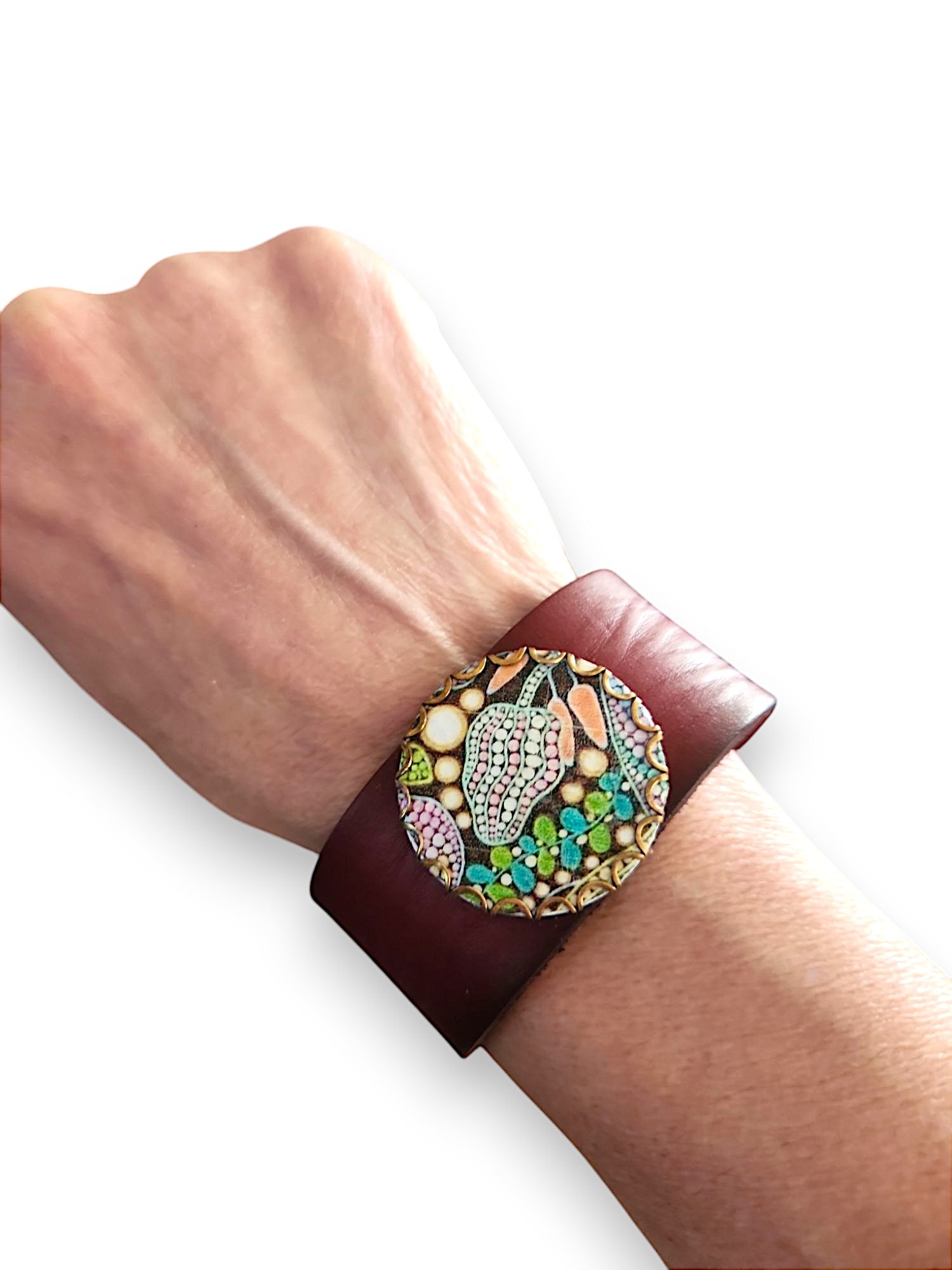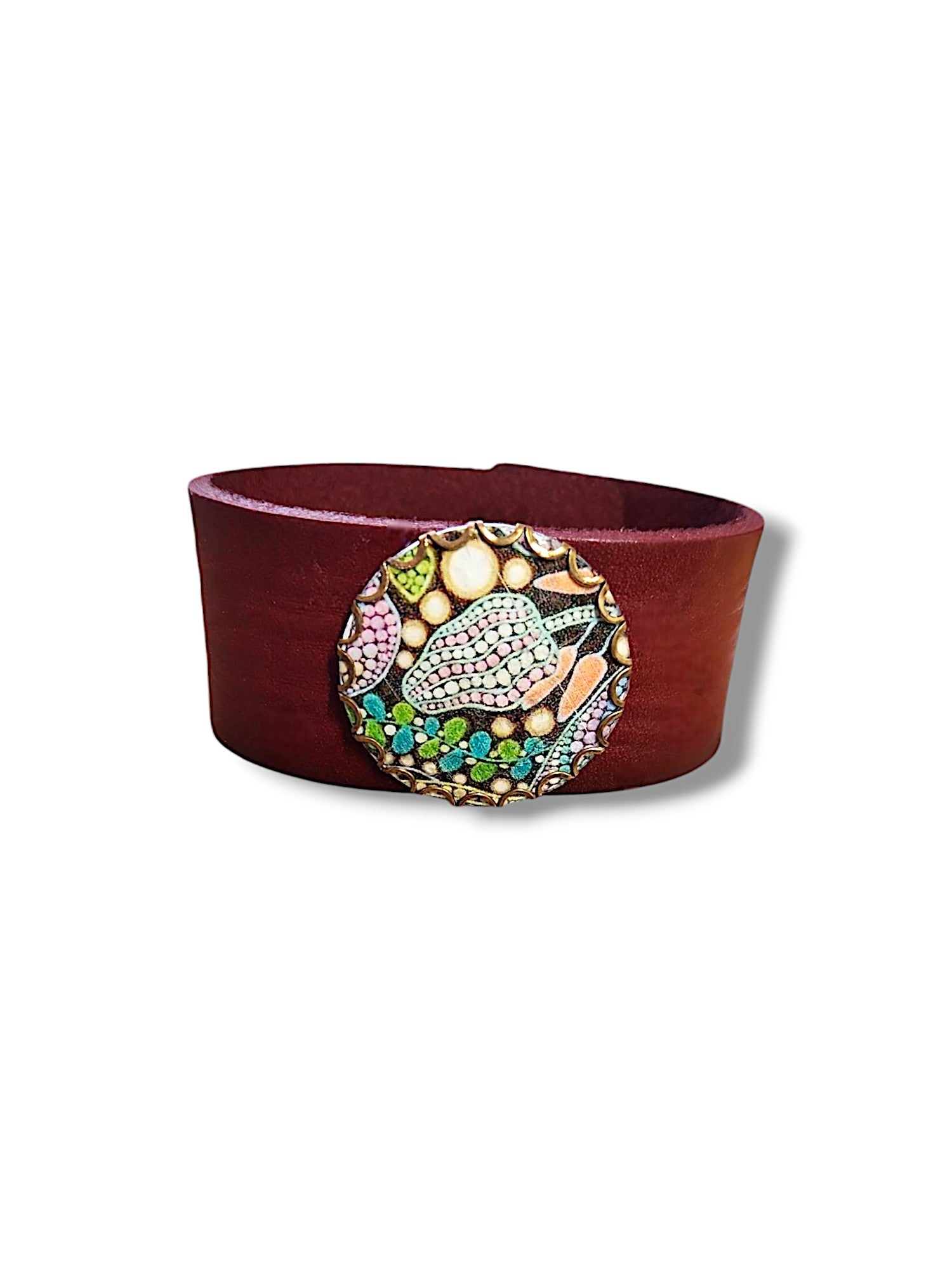 Turn heads with this handcrafted leather cuff, featuring a striking enameled copper focal piece. The copper centerpiece is adorned with a hand-printed, colorful decal that has been expertly fused for durability and vibrance.