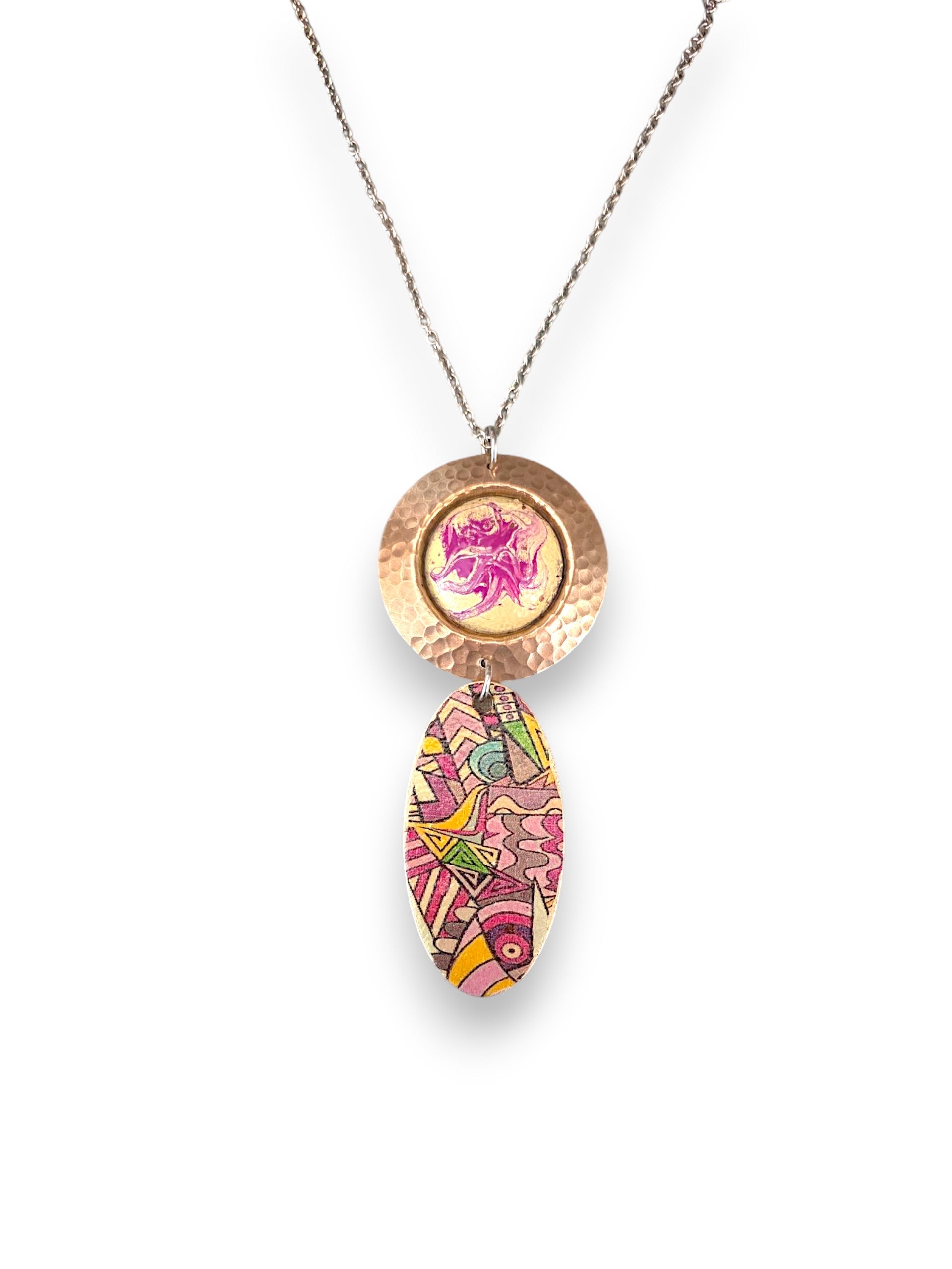 Experience the perfect harmony of tradition and innovation. This striking necklace combines ancient enameling techniques with modern laser precision and decal innovation, all set in beautiful recycled copper. It's designed for those who appreciate both timeless craftsmanship and a fresh, bold aesthetic. Don't be a wallflower—let your jewelry be a conversation starter! 💚